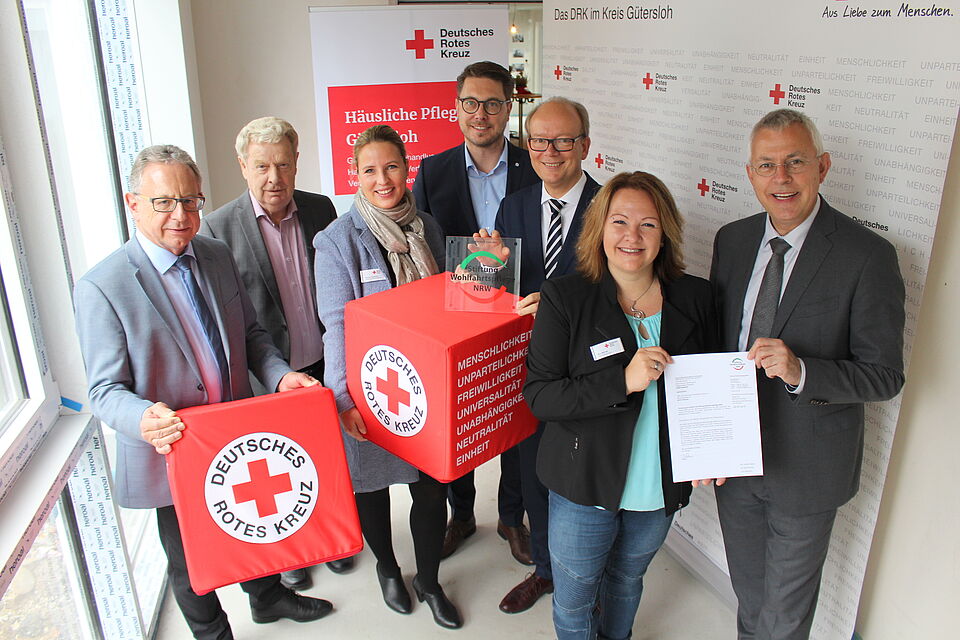 Mit 27.900 Euro unterstützt die Stiftung Wohlfahrtspflege NRW die Wohngruppe (WG) für Menschen mit Demenz und anderen gerontopsychiatrischen Erkrankungen des Deutschen Roten Kreuzes (DRK) in Rheda am Bahndamm. Den Förderbescheid übergab Stiftungsvorstand Norbert Killewald. Gemeinsam mit André Kuper, Präsident des Landtages NRW, besuchte er die fast fertiggestellten Räumlichkeiten. Dort finden zurzeit noch die letzten Arbeiten statt, bevor Anfang 2020 die ersten Bewohner*innen einziehen können.