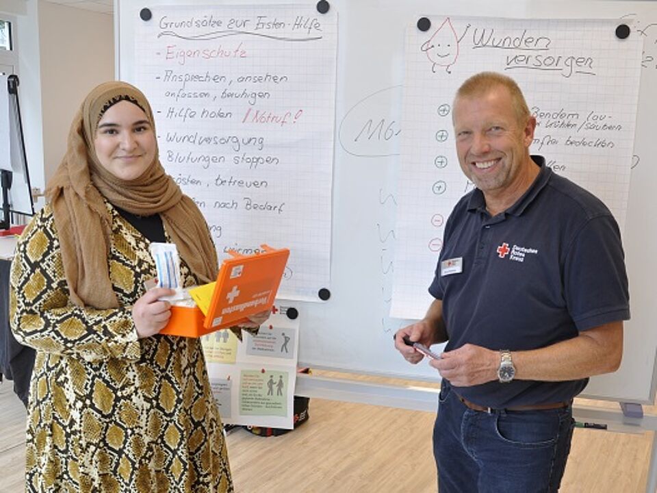 Die Unterschiede könnten kaum größer sein: Sie – eine frisch gebackene 20 Jahre junge Schulabgängerin, überzeugte Kopftuchträgerin aus einem muslimisch geprägten Elternhaus in Halle, er – ein 59-jähriger verheirateter Familienvater aus Gütersloh ohne Bezug zu einer Glaubensgemeinschaft, der am Ende seines Berufslebens steht. Und doch verbindet diese beiden von Grund auf verschiedenen Menschen etwas. Denn beide sind zurzeit im Bundesfreiwilligendienst beim Kreisverband Gütersloh des Deutschen Roten Kreuzes. Schwerpunkt ihrer Arbeit hier: Organisation und Leitung von Rotkreuzkursen.