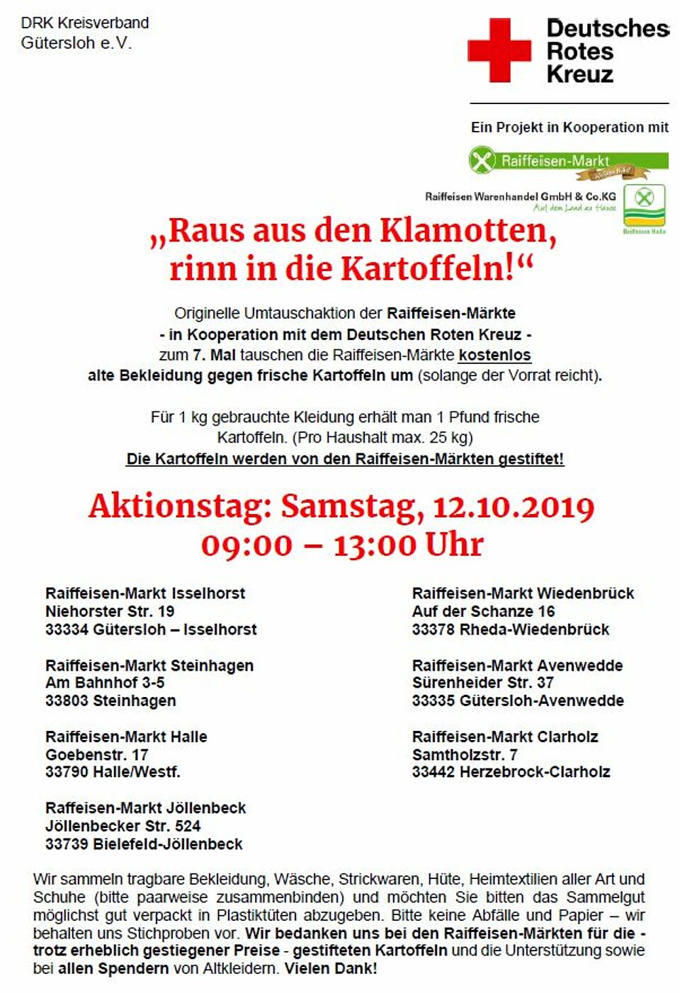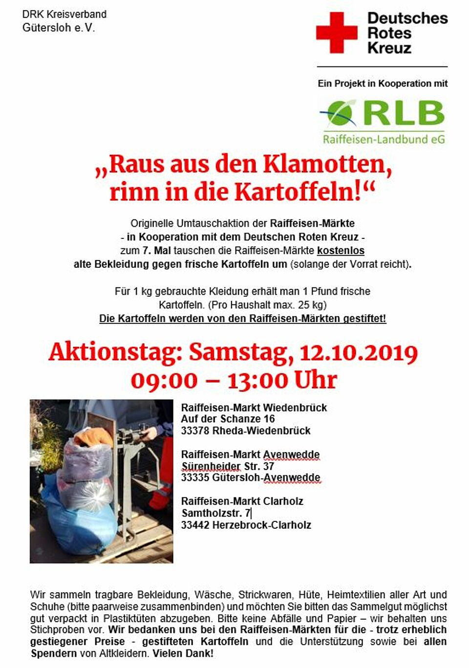 Am Samstag, 12. Oktober 2019 in der Zeit von 9.00 – 13.00 Uhr können Sie an vier Raiffeisen Märkten in der Region wieder gebrauchte Kleidung gegen Kartoffeln tauschen.