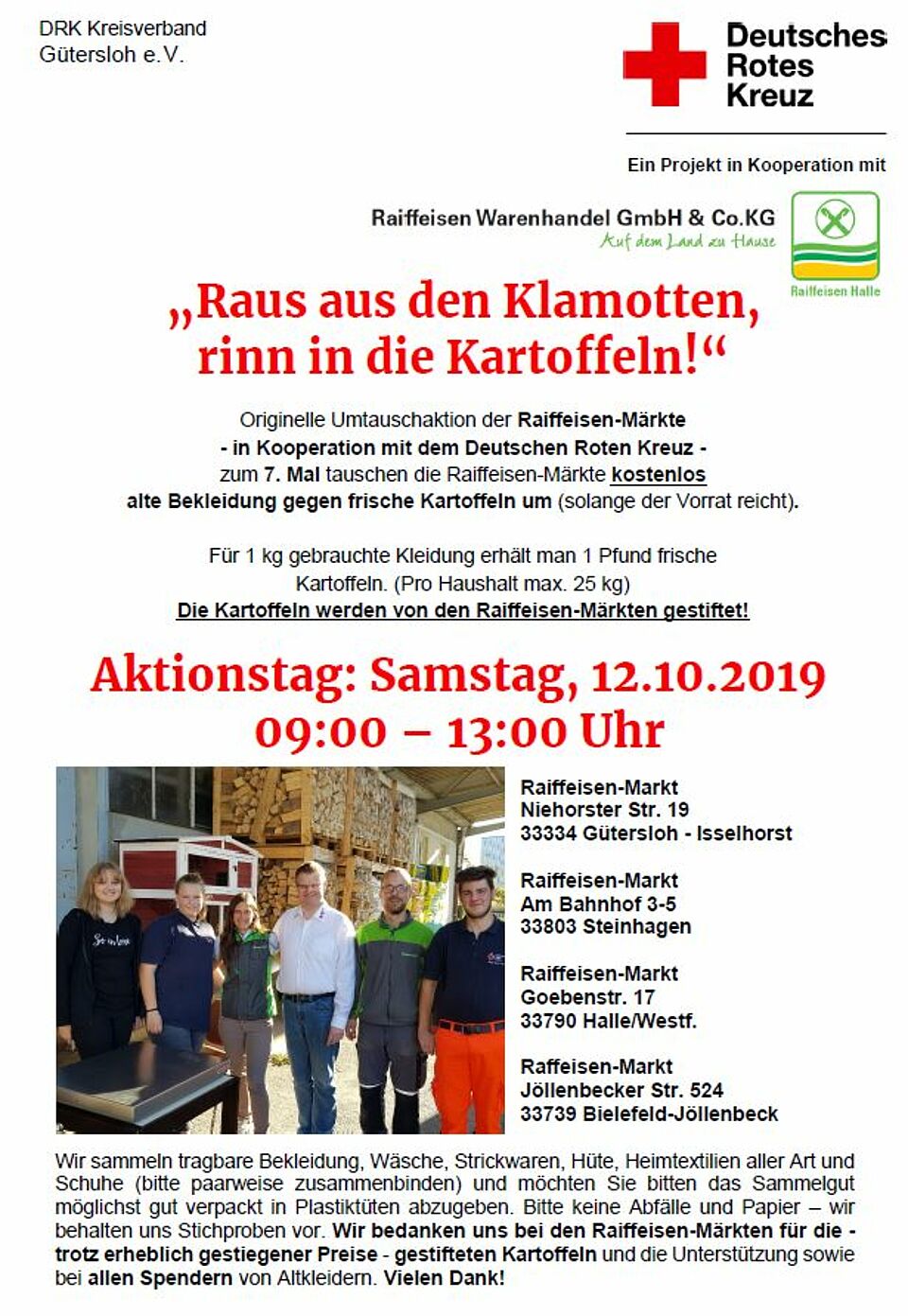 Bringen Sie am Samstag tragbare Kleidung, Schuhe, Wäsche und Heimtextilien bitte gut verpackt zu den Raiffeisen Märkten nach Steinhagen, Isselhorst, Halle/Westf. oder Jöllenbeck. Bringen Sie am Samstag tragbare Kleidung, Schuhe, Wäsche und Heimtextilien bitte gut verpackt zu den Raiffeisen Märkten nach Steinhagen, Isselhorst, Halle/Westf. oder Jöllenbeck oder zu den Raiffeisenmärkten Wiedenbrück, Clarholz oder Avenwedde