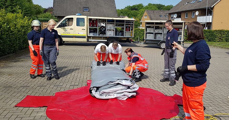 Unterrichtet wurden zu Gefahren an der Einsatzstelle und Unfallverhütung, Gefahrstoffe im Einsatz, Umweltschutz und Wasserversorgung. Ferner erfolgte eine Unterweisung für den Betrieb von Flüssiggasgeräten, Handwerkzeugen, Leitern und Tritte, sowie Koch- und Heizgeräte. In einem großen praktischen Teile wurde der Zeltbau, sozusagen vom konventionellen Gestängezelt bis hin zum modernen Dauergebläsezelt geübt, der Umgang mit Einsatzfahrzeugen und mit der Ausstattung des Einsatzanhängers Technik und Sicherheit unterwiesen.