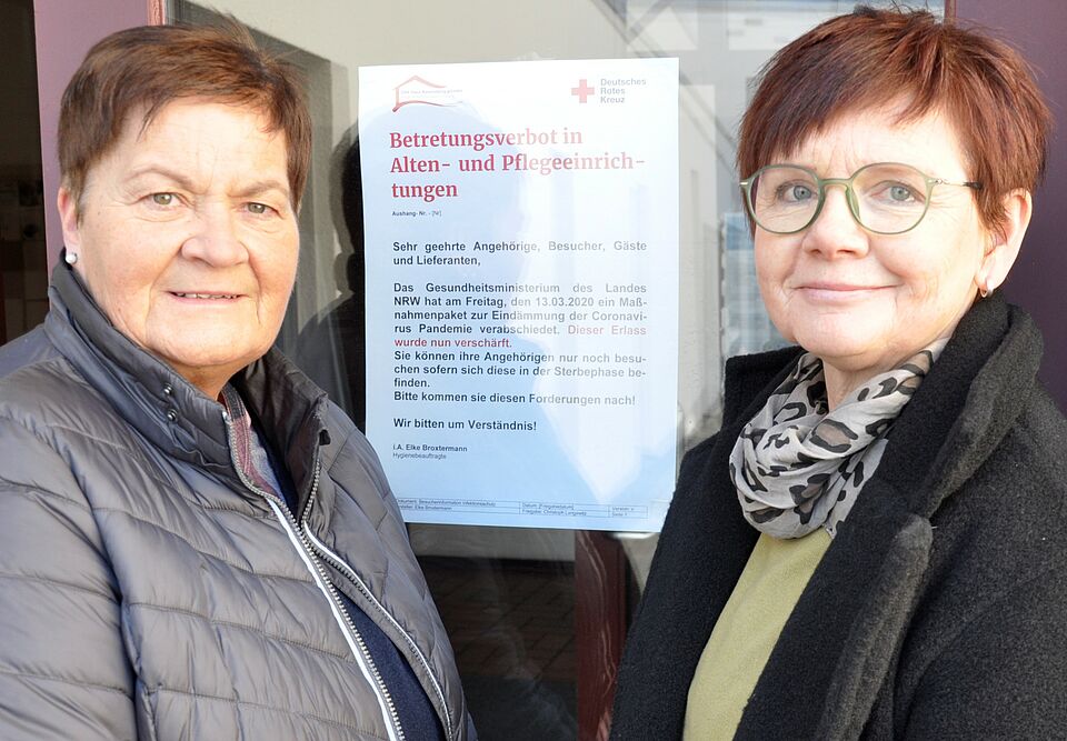 So herrscht für das Haus mit 80 Plätzen, darunter zehn Kurzzeitpflegeplätze, ein generelles Betretungsverbot. Ein Aushang an der Eingangstür weist darauf hin. Das Verbot betrifft nicht nur Dienstleister wie Frisöre, Physiotherapeuten oder Fußpfleger, die sonst regelmäßig zu Gast sind. Auch Angehörigen ist es derzeit nicht gestattet, die Bewohner/innen zu besuchen. Lediglich für den Fall einer Sterbebegleitung öffnet sich die Tür für kurze Zeit. „Unseren Bewohnern fällt die Kontaktsperre nicht leicht. Wir sind bemüht, uns noch intensiver um sie zu kümmern“, sagt Andrea Lehnert.