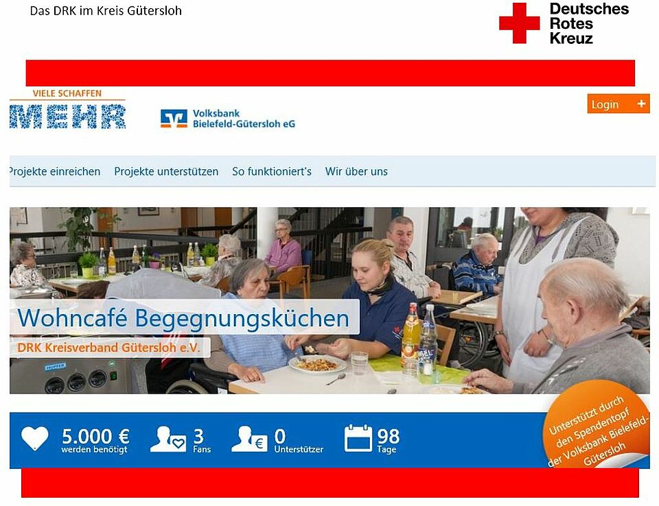 Wir möchten daher auch Sie bitten unser Projekt "Wohncafé Begegnungsküchen" mit einer Spende zu unterstützen. Wir bedanken uns falls gewünscht mit einer Einladung zum "Spendernachmittag" oder über Ihre Nennung als Sponsor, Sie können aber auch völlig anonym spenden.