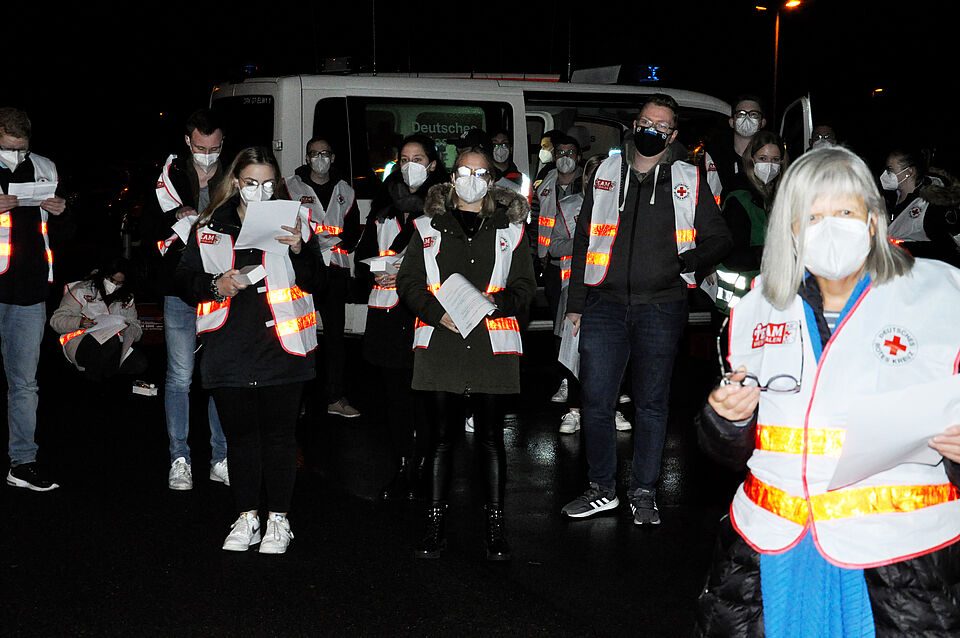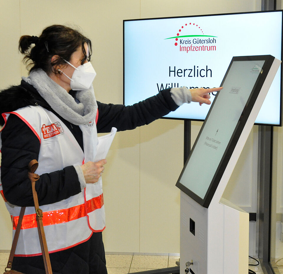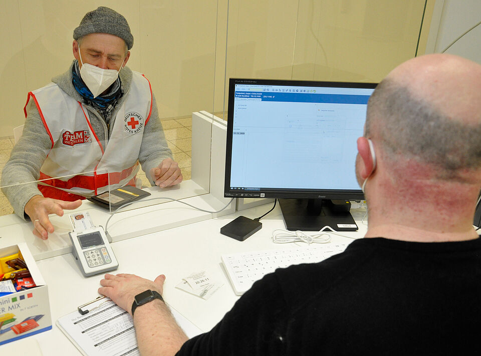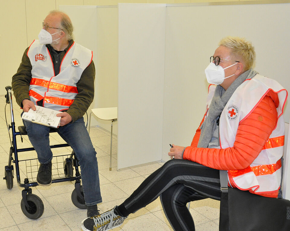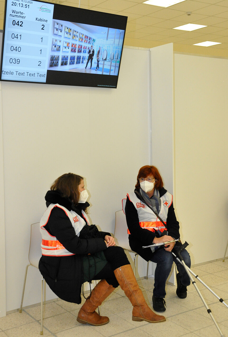 Knapp 20 Einsatzkräfte aus Gütersloh, Rietberg-Neuenkirchen, Schloß Holte-Stukenbrock sowie vom Kreisverband übernahmen Schlüsselaufgaben wie Empfang, Betreuungs- und Ordnungsdienste und Verwaltungsaufgaben. Als Probanden hatten sich neben einigen Auszubildenden der Kreisverwaltung auch etwa 40 Freiwillige aus dem DRK-Team Westfalen zur Verfügung gestellt. Mit der Präzision eines Schweizer Uhrwerks wurden sie nach zeitlichen Vorgaben – zum Teil mit Hilfsmitteln wie Rollstühlen oder Krücken ausgestattet – unter realistischen Bedingungen durch das Zentrum geschleust. Jeweils drei Minuten werden für ein ärztliches Vorgespräch und den eigentlichen Impfvorgang einkalkuliert. Insgesamt acht Impfstraßen führen durch das Zentrum. Der Kreis Gütersloh rechnet damit, dass der gesamte Impfprozess einschließlich einer 30-minütigen Ruhezeit etwa eine Stunde in Anspruch nehmen wird. Die Höchstzahl der Impfungen pro 12-Stunden-Tag liegt rein rechnerisch bei 1.920. Realistischerweise geht der Kreis Gütersloh aber von rund 1.000 Impfungen am Tag aus.